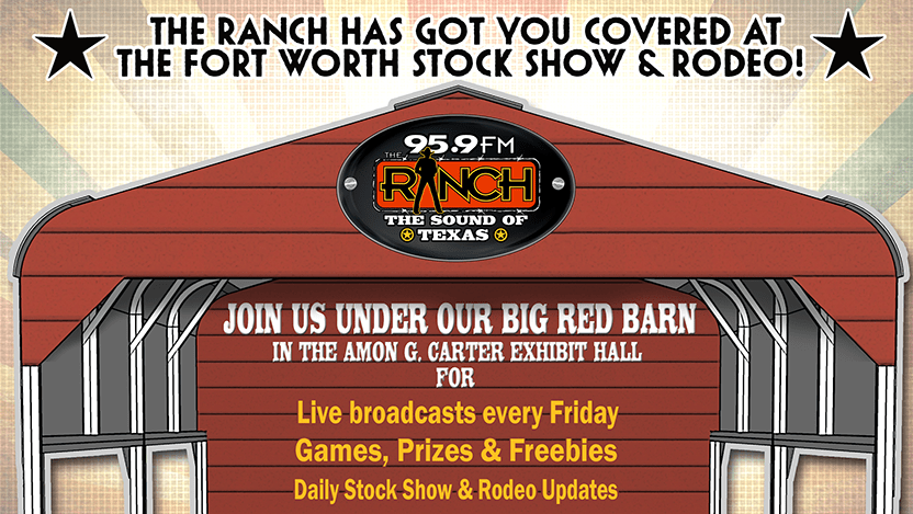 Find 95.9 The Ranch in the Amon G Carter Exhibit Hall every day of the 2026 Fort Worth Stock Show and Rodeo Jan 16th – Feb 7th with live broadcasts, and jock appearances, music, merch and giveaways! Just look for the “Big Red Barn”, built by Jag Metals!