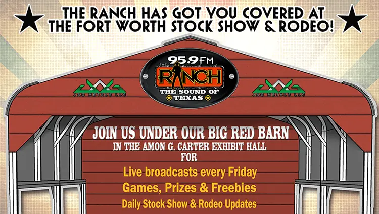 Find 95.9 The Ranch in the Amon G Carter Exhibit Hall every day of the 2026 Fort Worth Stock Show and Rodeo Jan 16th – Feb 7th with live broadcasts, and jock appearances, music, merch and giveaways! Just look for the “Big Red Barn”, built by Jag Metals!