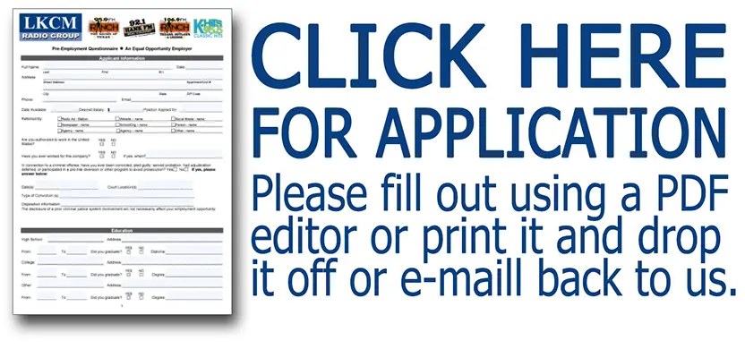 Looking for an exciting career change? Are you motivated and do you like people? Have you ever thought about working in radio? 95.9 The Ranch and our sister stations 106.9 The Ranch, 92.1 Hank FM and K-HITS 95.5 are seeking new Account Executives. Account executives at The Ranch create integrated marketing programs that help businesses grow. It’s full time employment with great benefits! Experience in advertising or sponsorship sales is recommended. Digital sales or event marketing are a plus. CLICK HERE FOR FULL DETAILS