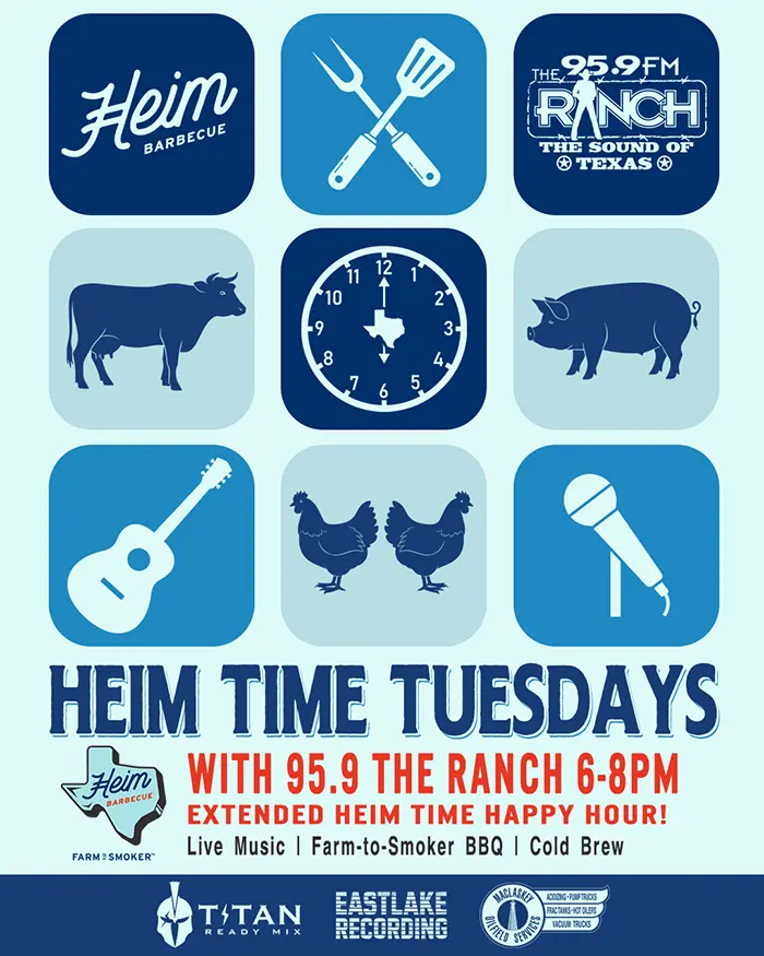 Make an evening of it with Heim’s extended happy hour featuring award-winning farm-to-smoker BBQ, cold brews, and plenty of patio vibes. Add in Ranch games, prizes, and giveaways, and you’ve got the perfect Tuesday night hang.