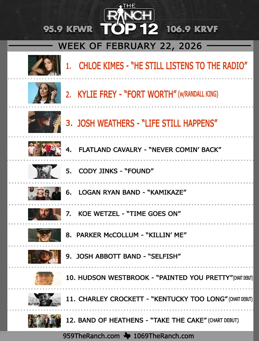 Join Heather Anderson every Sunday from 10-11 AM as she counts down the Top 12 songs each week on the Ranch Music Chart brought to you by Line-X of Fort Worth. 95.9 The Ranch is the leader in Texas, Red Dirt & Americana music and this show highlights the biggest and the best of the Ranch playlist each week.