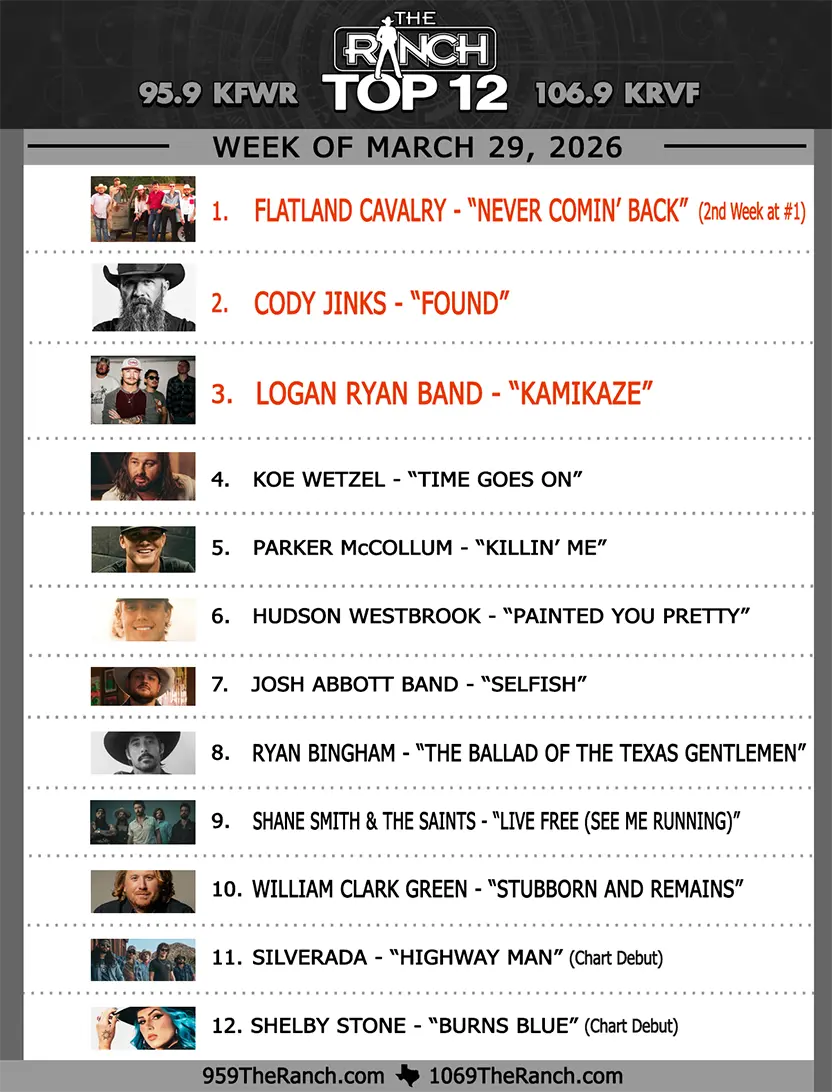 Join Heather Anderson every Sunday from 10-11 AM as she counts down the Top 12 songs each week on the Ranch Music Chart brought to you by Line-X of Fort Worth. 95.9 The Ranch is the leader in Texas, Red Dirt & Americana music and this show highlights the biggest and the best of the Ranch playlist each week.