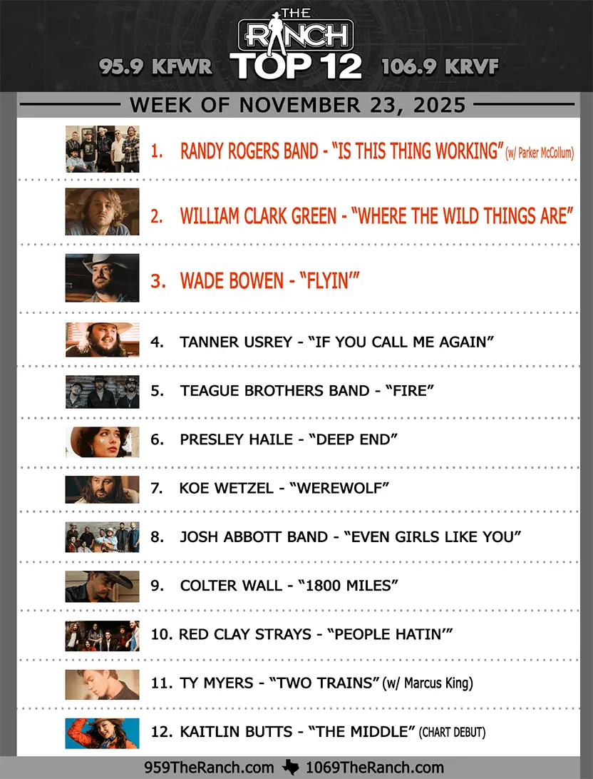 Join Heather Anderson every Sunday from 10-11 AM as she counts down the Top 12 songs each week on the Ranch Music Chart brought to you by Line-X of Fort Worth. 95.9 The Ranch is the leader in Texas, Red Dirt & Americana music and this show highlights the biggest and the best of the Ranch playlist each week.
