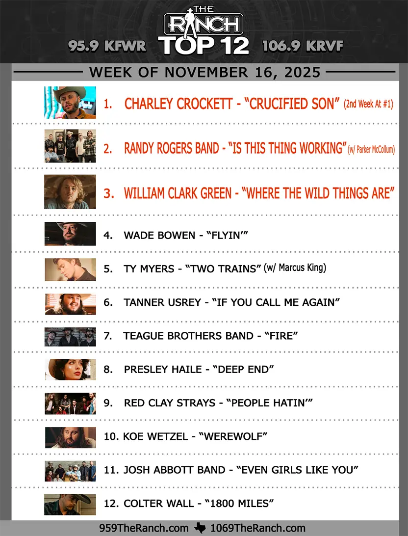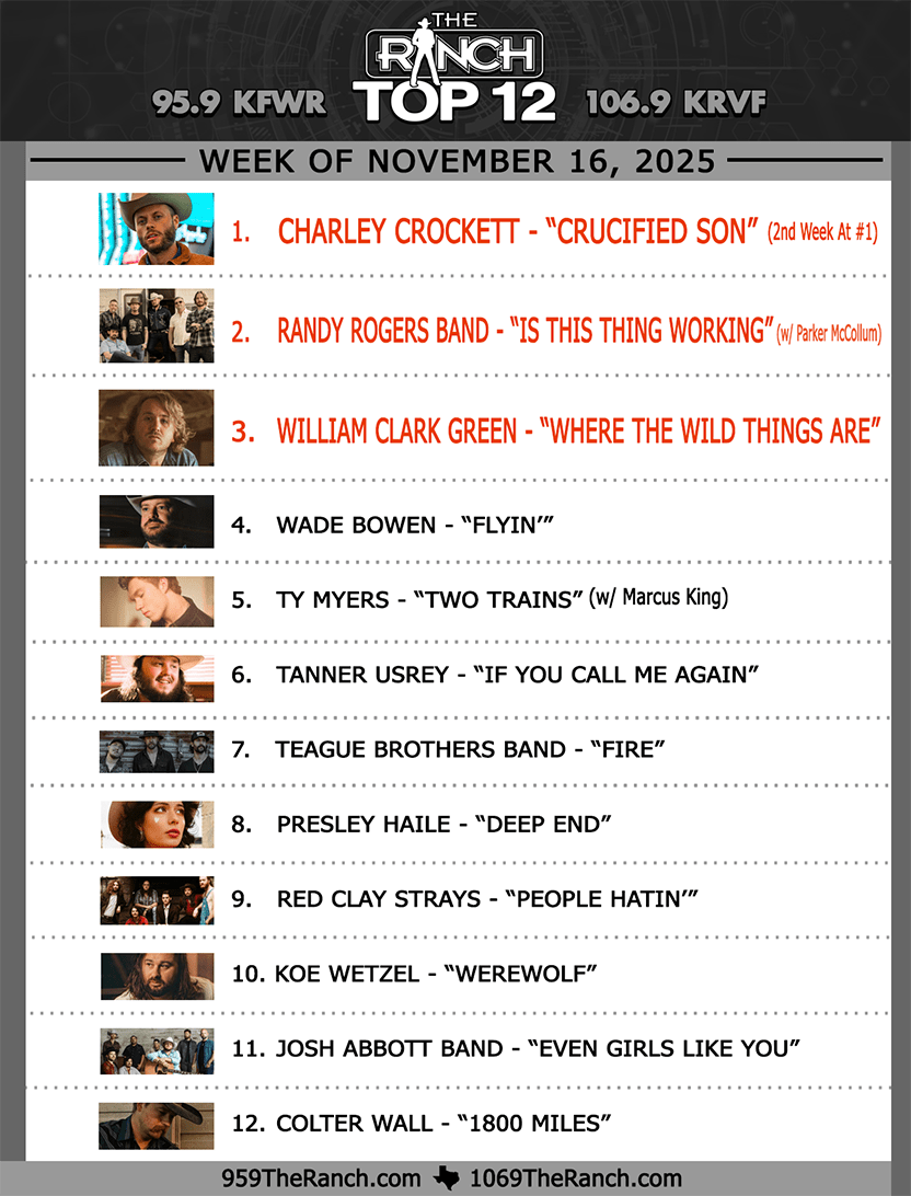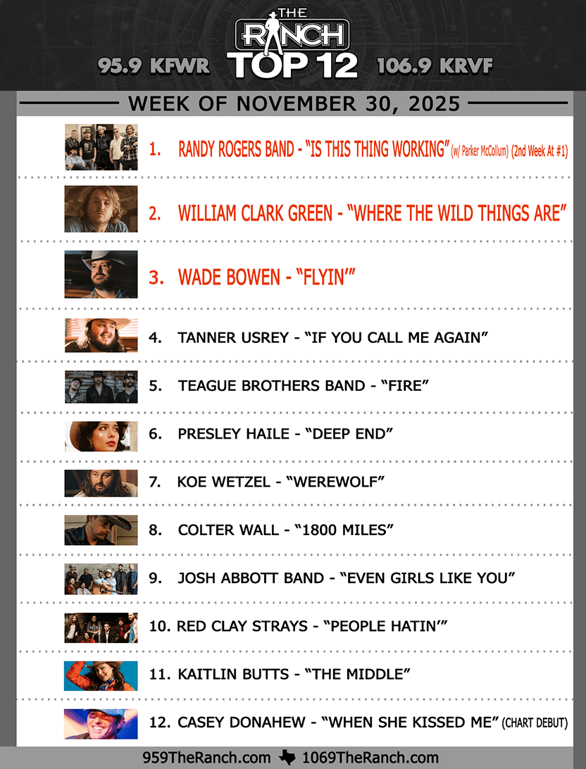 Join Heather Anderson every Sunday from 10-11 AM as she counts down the Top 12 songs each week on the Ranch Music Chart brought to you by Line-X of Fort Worth. 95.9 The Ranch is the leader in Texas, Red Dirt & Americana music and this show highlights the biggest and the best of the Ranch playlist each week.