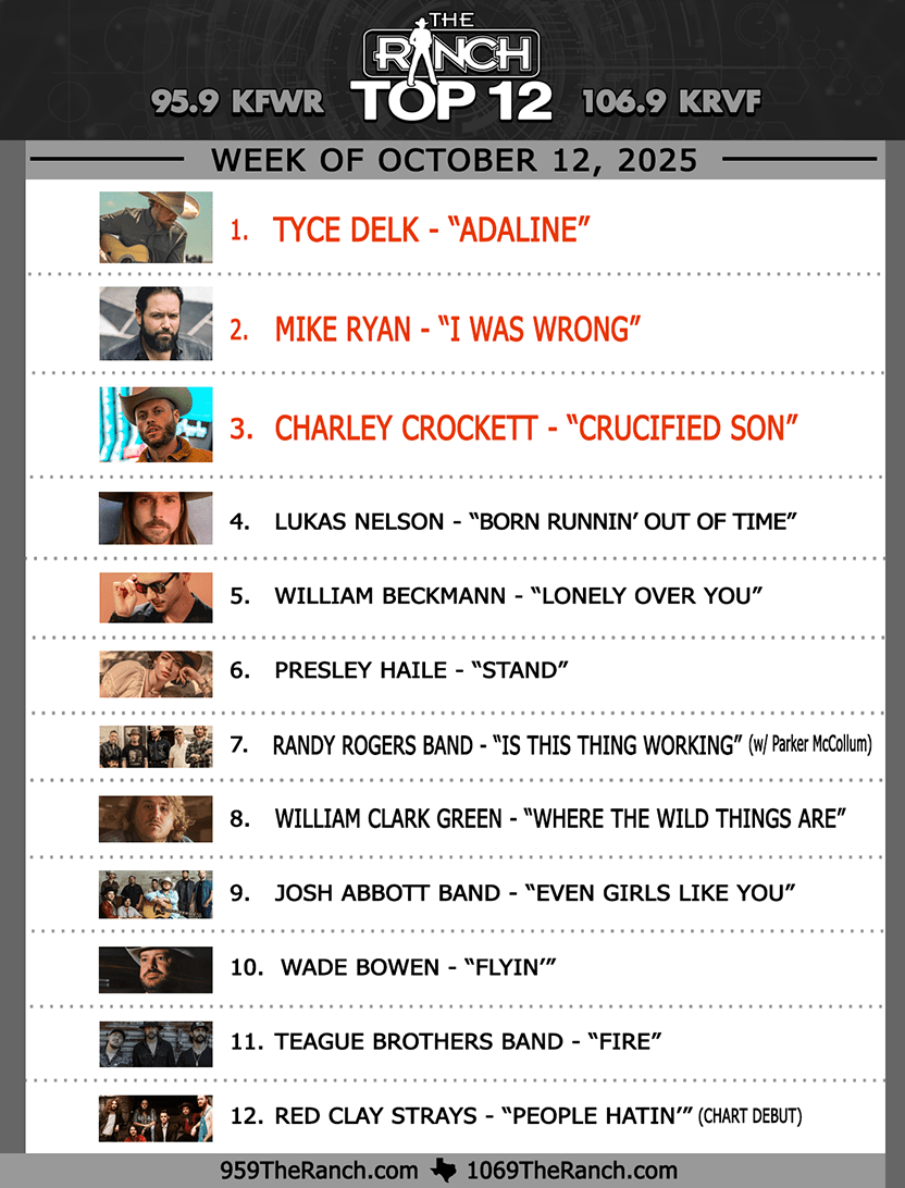 Join Heather Anderson every Sunday from 10-11 AM as she counts down the Top 12 songs each week on the Ranch Music Chart brought to you by Line-X of Fort Worth. 95.9 The Ranch is the leader in Texas, Red Dirt & Americana music and this show highlights the biggest and the best of the Ranch playlist each week.