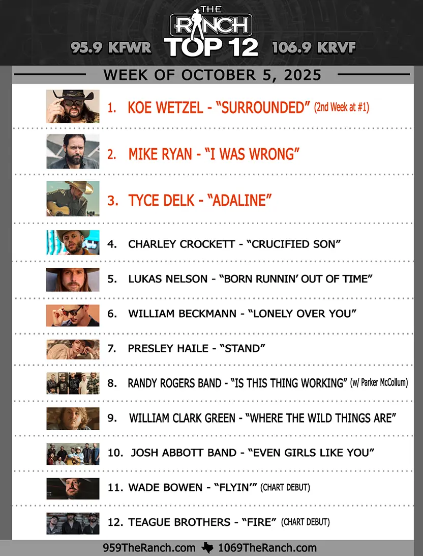 Join Heather Anderson every Sunday from 10-11 AM as she counts down the Top 12 songs each week on the Ranch Music Chart brought to you by Line-X of Fort Worth. 95.9 The Ranch is the leader in Texas, Red Dirt & Americana music and this show highlights the biggest and the best of the Ranch playlist each week.